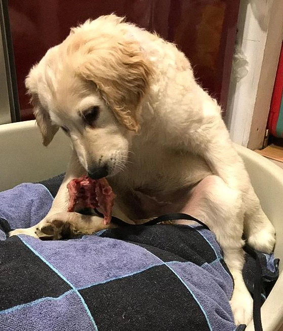 Iniciamos como con cualquier transición, con carne magra y un puré de zanahoria o calabaza, que si no presenta intolerancia podremos introducir huesos carnosos adecuados al tamaño. Lo habitual es que los cachorros que han estado con su madre y hermanos en condiciones adecuadas no presenten ansiedad con la comida, cosa que no suele suceder cuando han pasado hambre, miedo, etc. Si presentan ansiedad con la comida podemos triturar los huesos y o dar huesos muy blandos como son los cuellos de pollo, poco a poco cuando consiga confianza y calma podremos subir la dificultad.